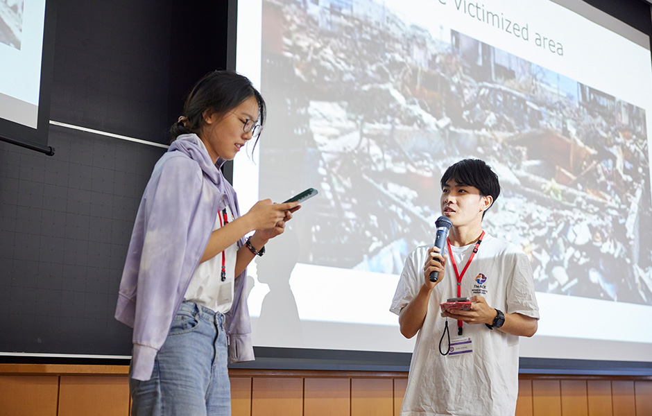 最終日となる9日(金)の冒頭では、コーディネーターの劉雯(リュウブン)特任准教授より全行程の振り返りを行いました。ファイナルプレゼンテーションには「スキット(寸劇)」形式を採用。学生たちは劇だけでなく動画や音響を効果的に使用し、「災害に強い社会をいかに作るか」というテーマで、創意工夫あふれるプレゼンテーションを繰り広げました。