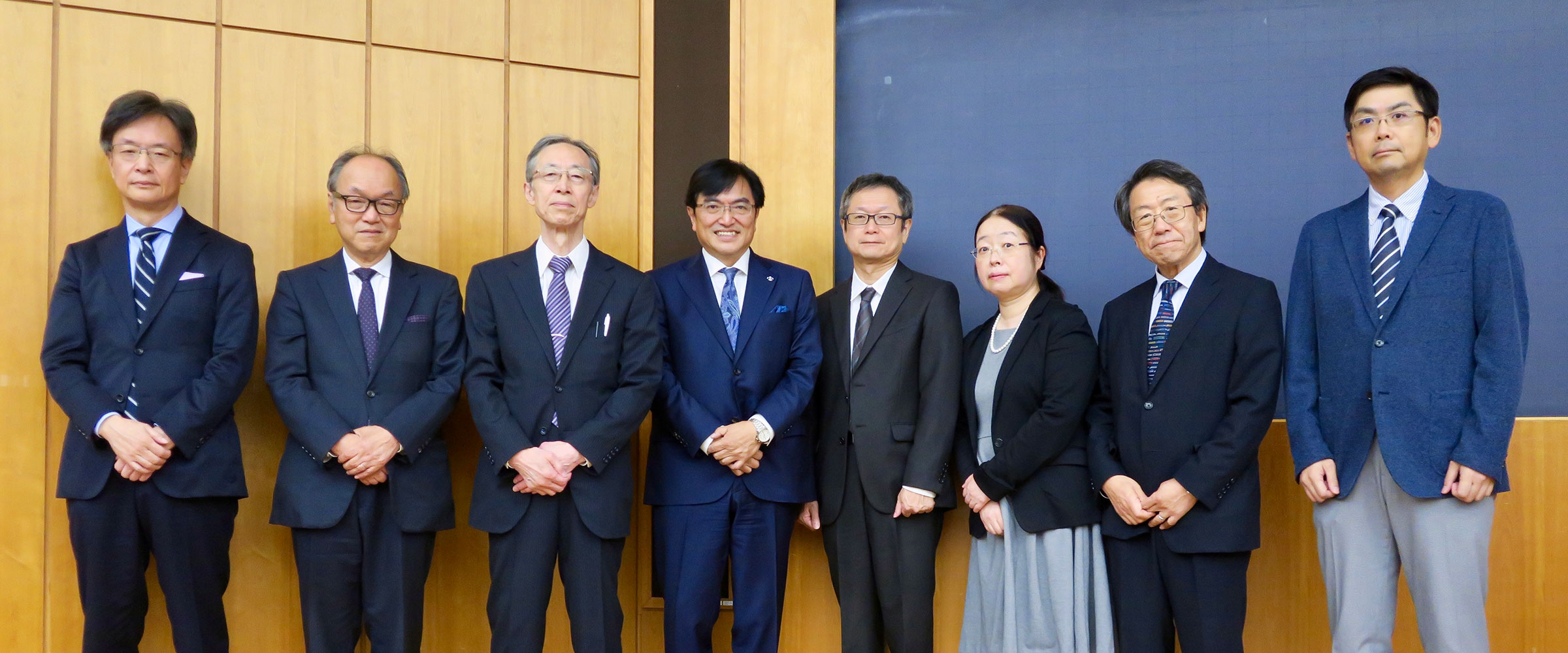 左から小林教授、梅津教授、大日方教授、西原廉太立教大学総長、吉川教授、奈須教授、老川教授、司会の岡部桂史立教学院史資料センター長
