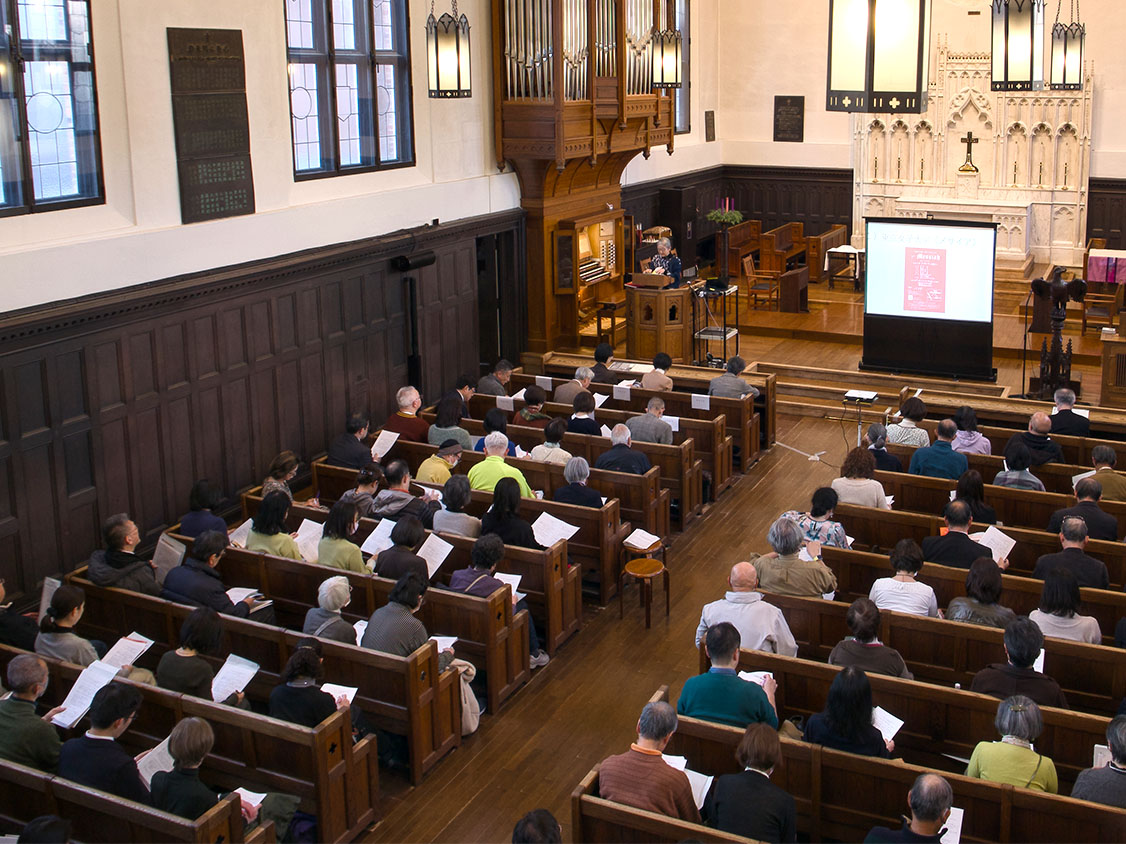 第63回メサイア演奏会(12月16日)に先立ち、今年の参加者をはじめ、歴代のメサイア実行委員やOBOG、教職員や音楽学会員、さらには、全国から大学メサイア関係者、メサイア愛好家が参集し、チャペルは満席となりました。